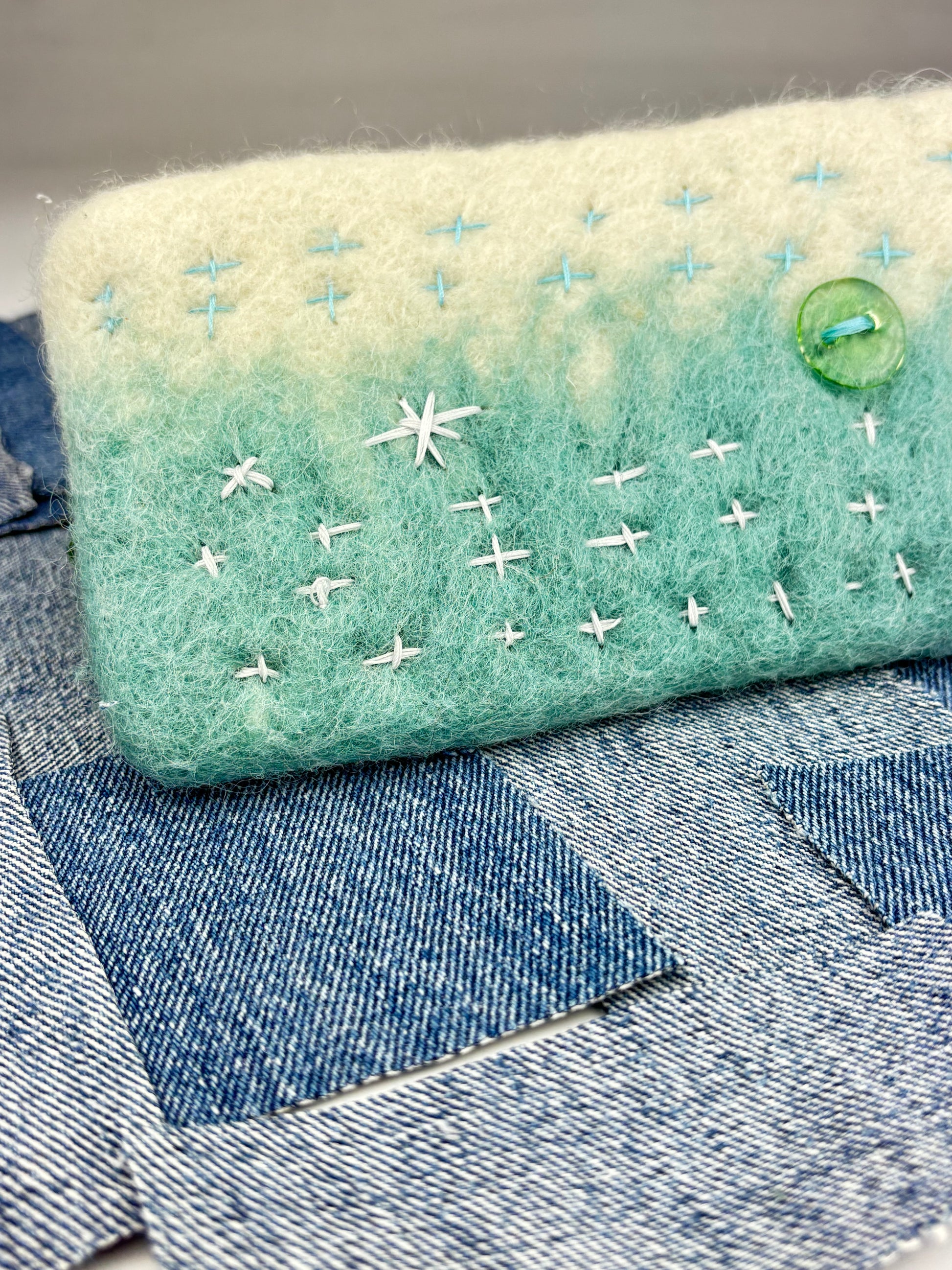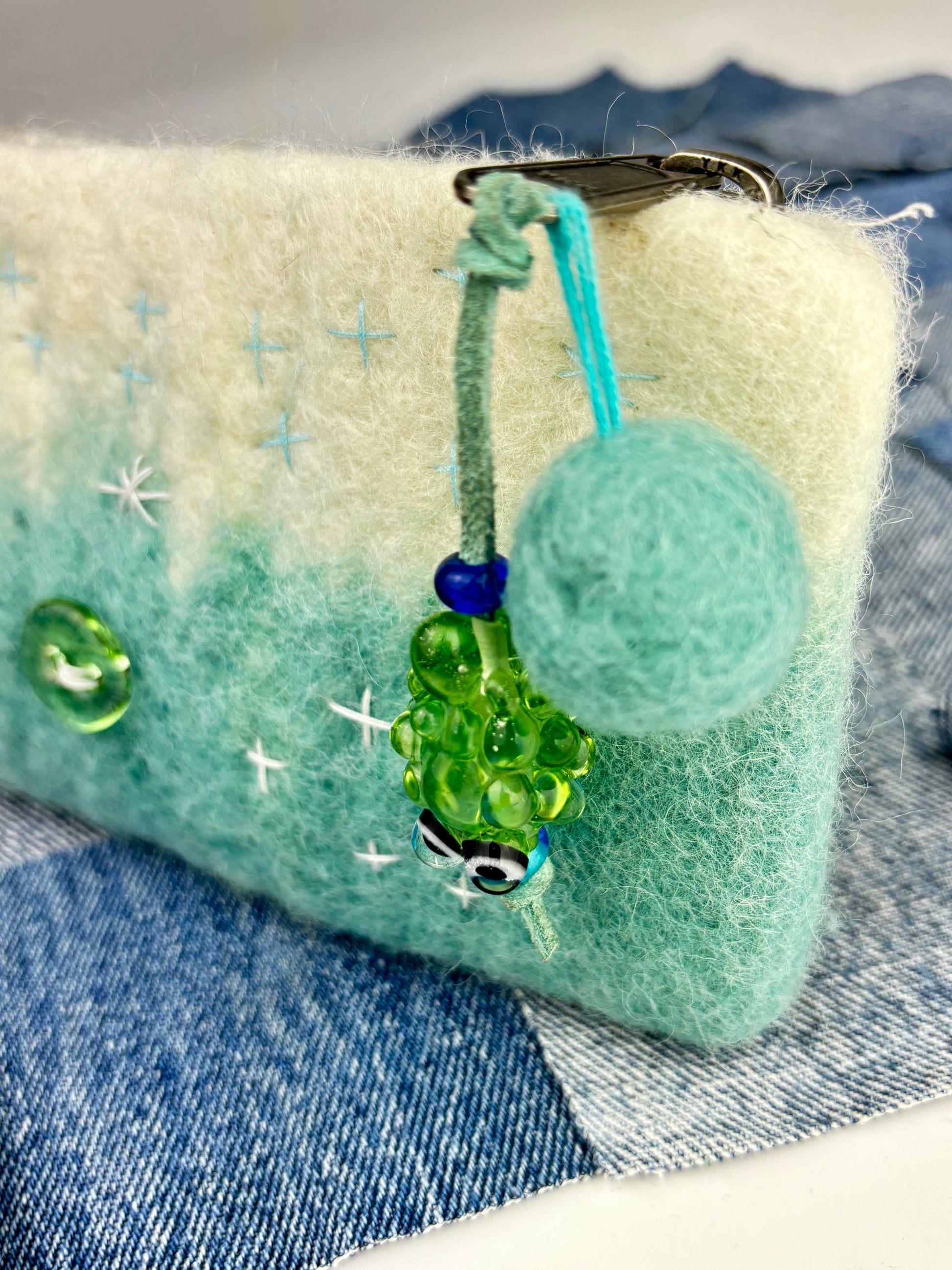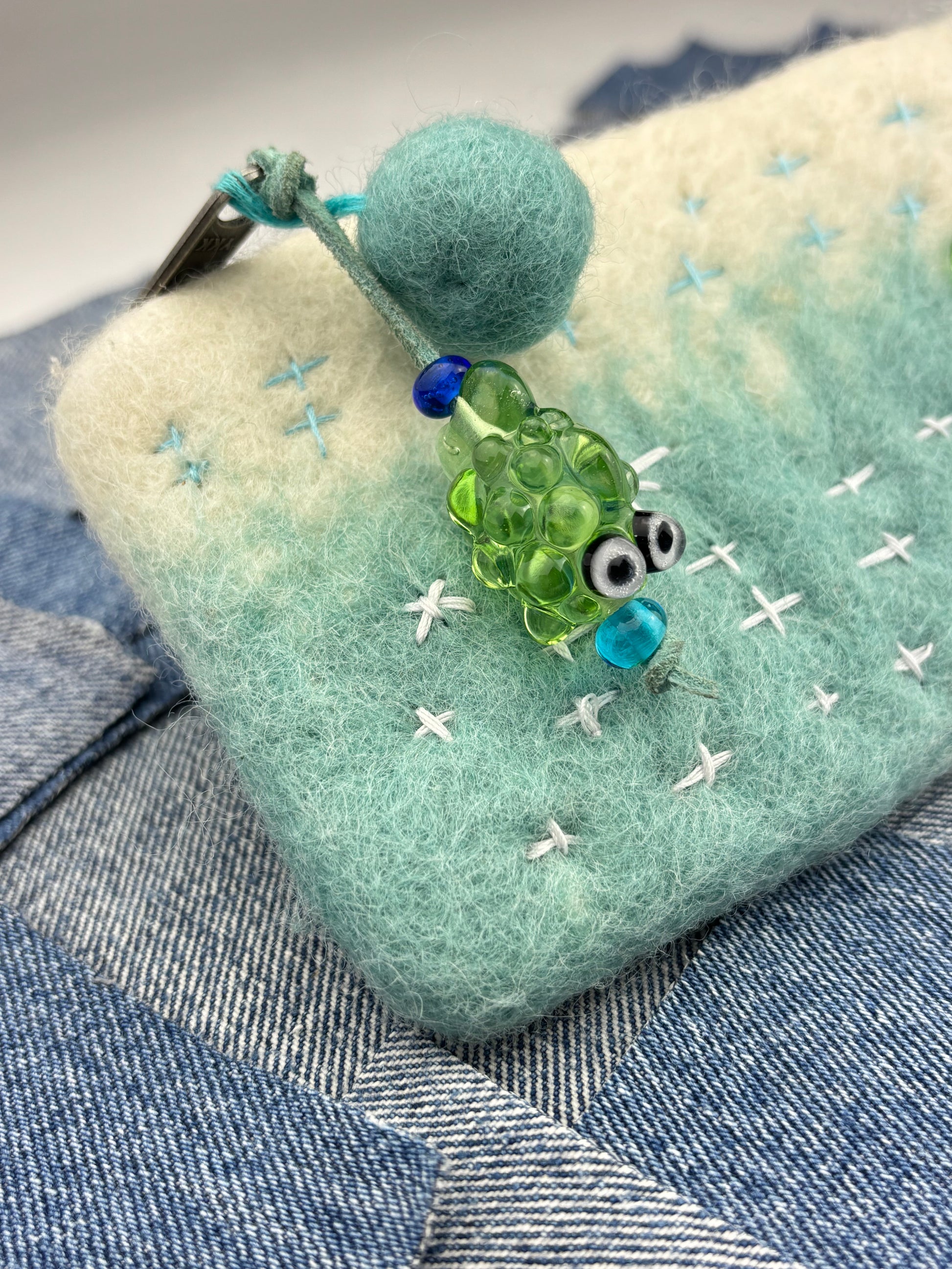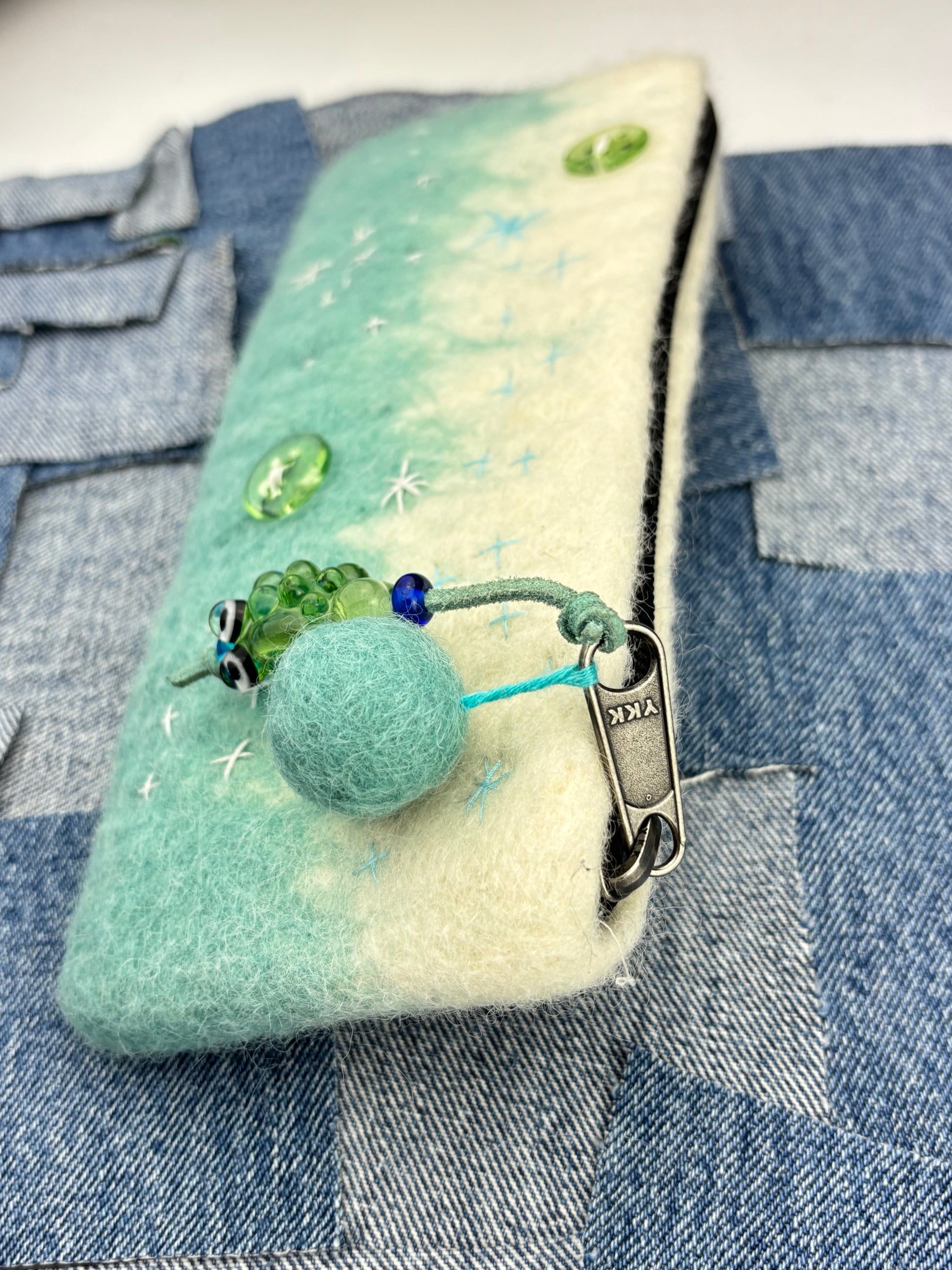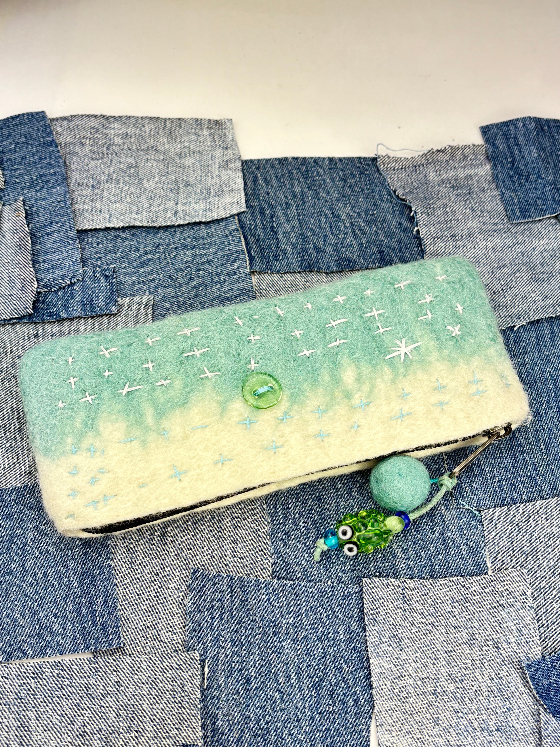 Naturally processed wool from my buddies farm in Oklahoma. Machine made in Los Angeles long zipper wallet with hand stitched Sashiko boro stitching, heavy duty YKK zipper, glass buttons, wool puff ball, and transparent green glass puffer fish zipper pull. The dye is done with a dip technique that creates a saturated bleeding effect.